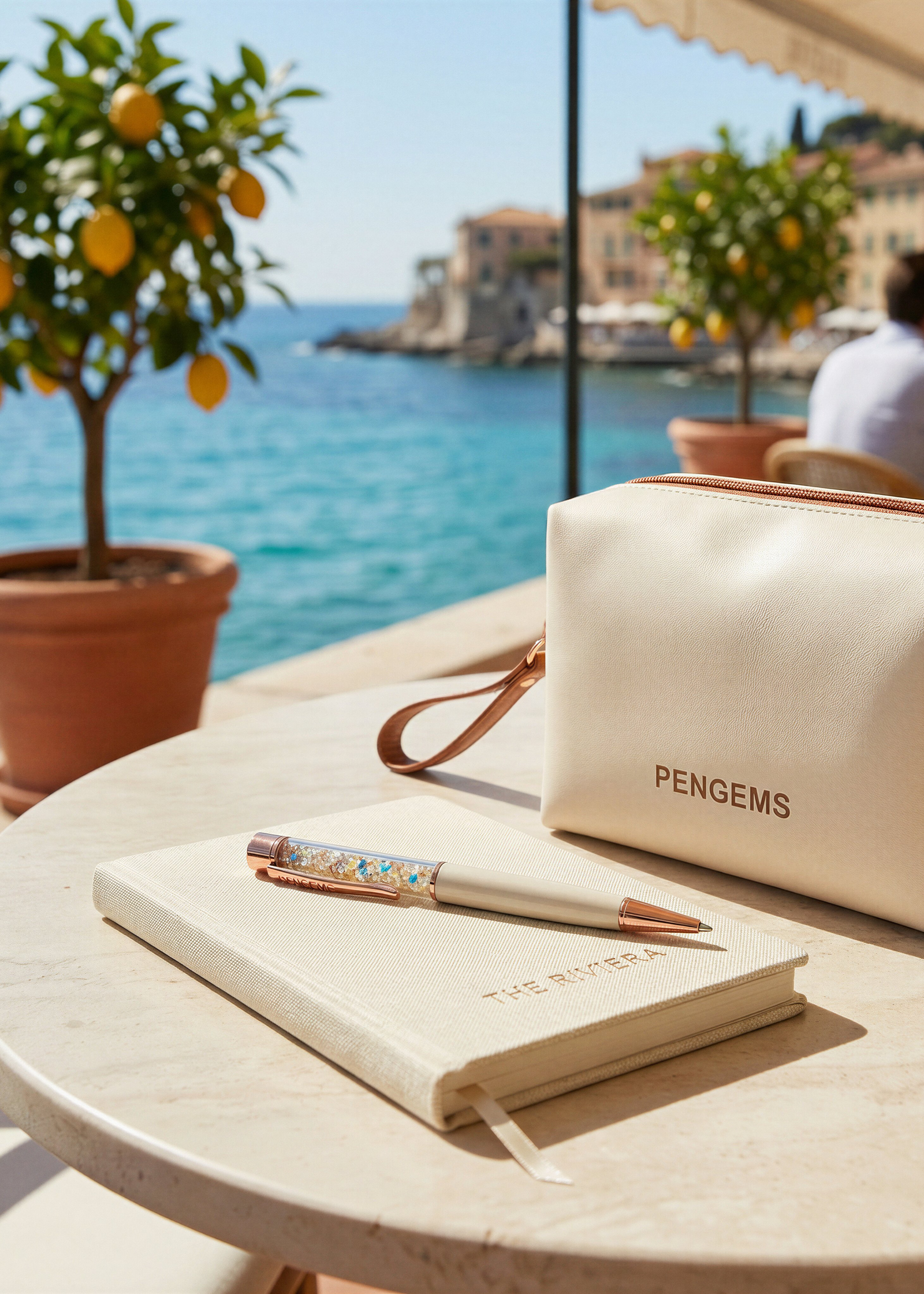 A limited-edition glam writing set inspired by a night worth dressing up for. Inside: a satin gold crystal pen, foil-detailed notepaper, a refillable fragrance atomizer, and curated details designed to feel like the start of something interesting.