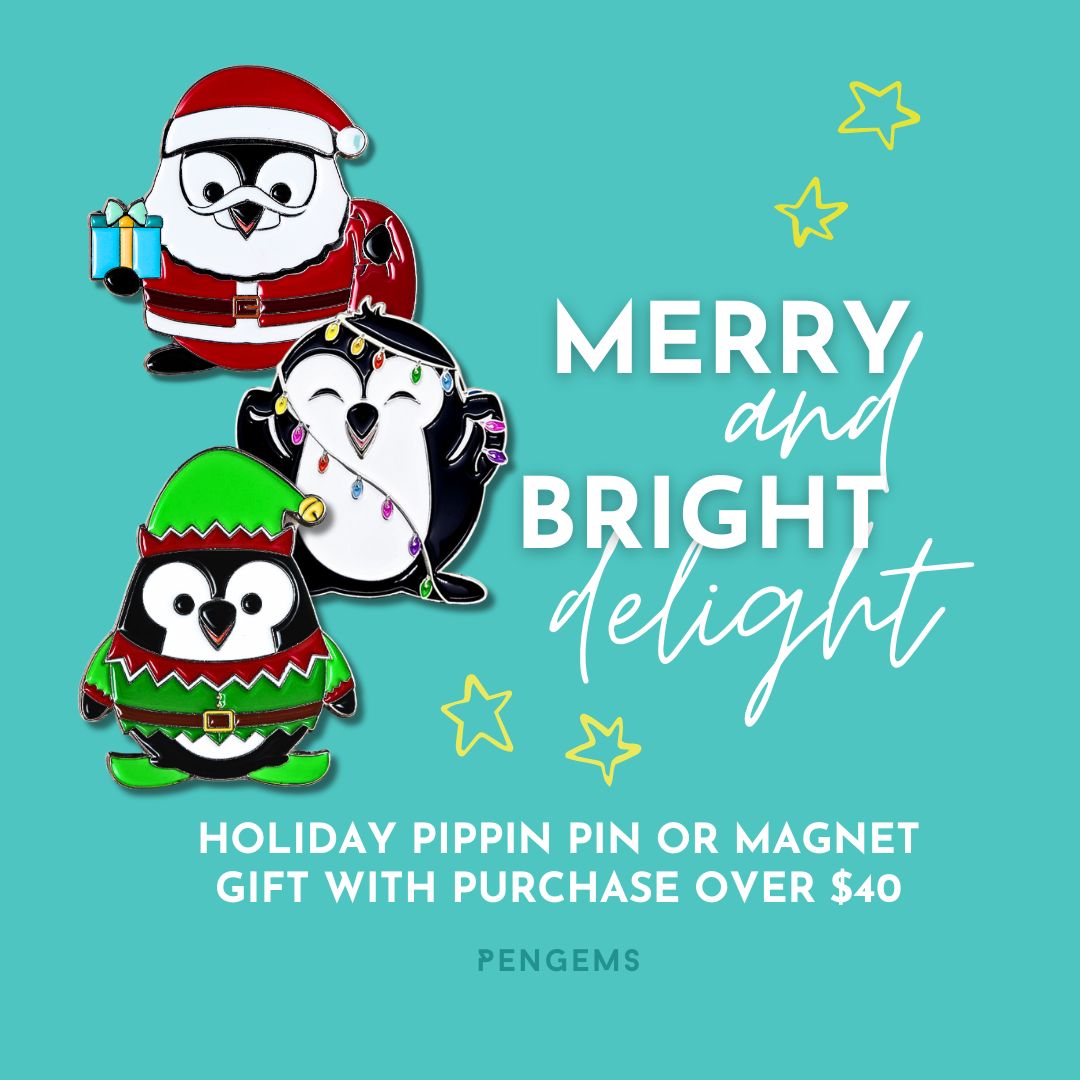 PenGems adds cheer to your holidays! Spend $40+ and pick a free pin or magnet with Pippin the Penguin in Christmas attire. Choose from Elf, Santa, or Light Pippin for festive fun. Limited-time offer to make your season merry! 🎄🐧🎁