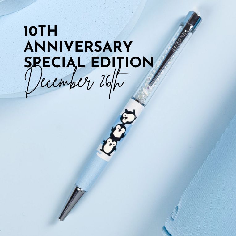 et ready to chill in style with our 10th Anniversary PenGem! Featuring a cool Antarctic blue barrel, a trio of Pippin Penguins, aurora crystals, and a snow-like gem on top – it's the perfect way to mark a decade of dazzle with PenGems.