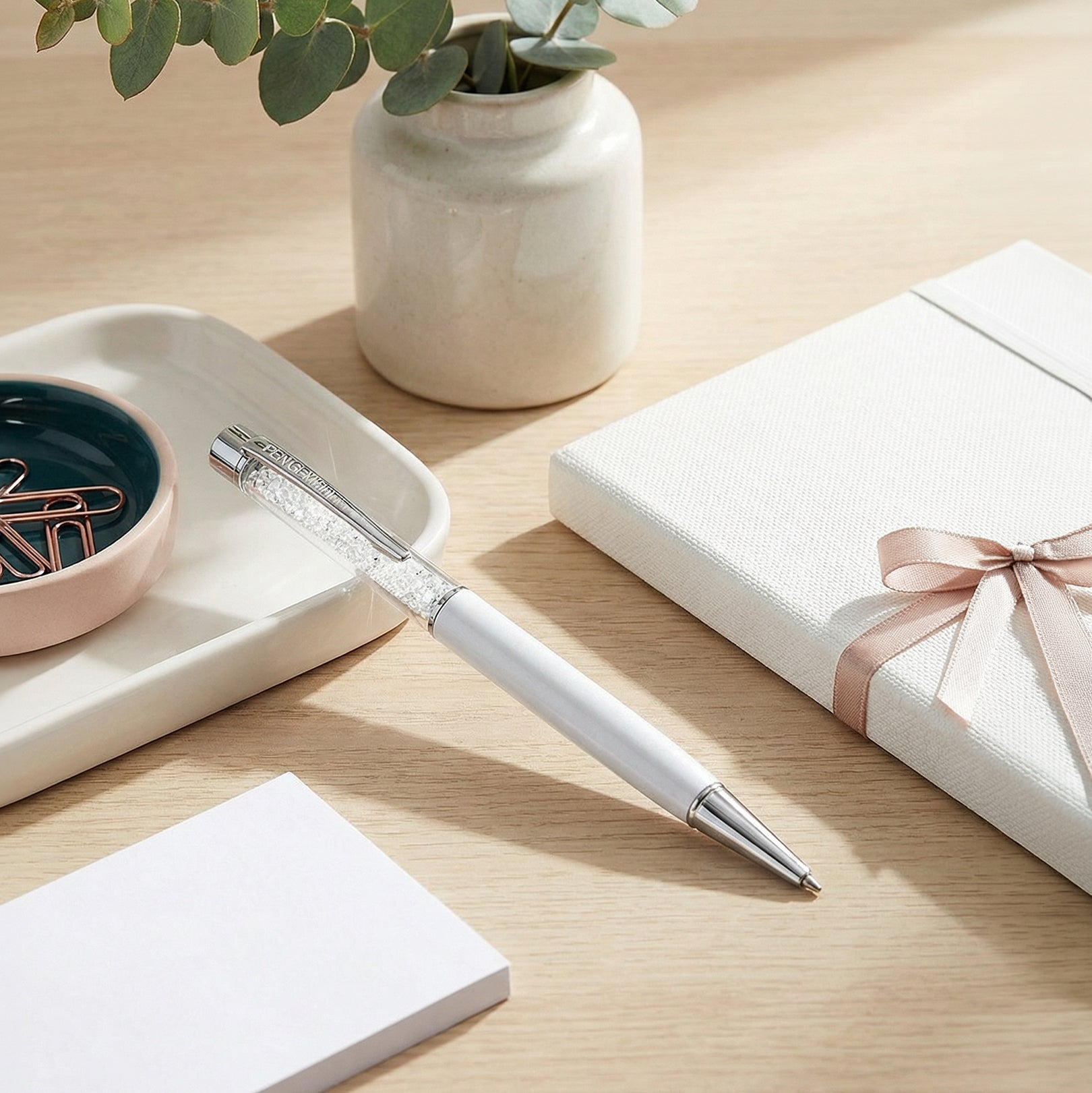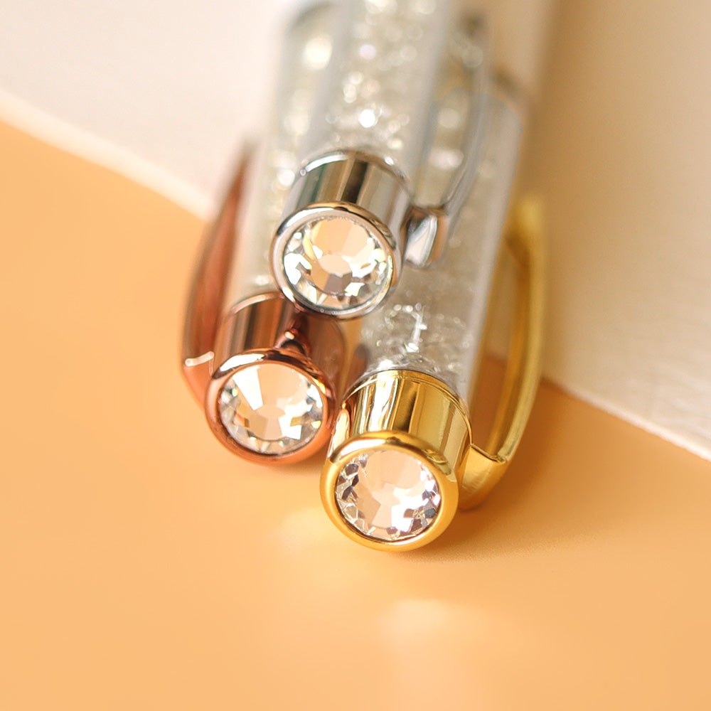A white gloss barrel filled with clear crystals, finished in your choice of silver, gold, or rose gold hardware. Clean, crisp, and giving fresh-page energy.